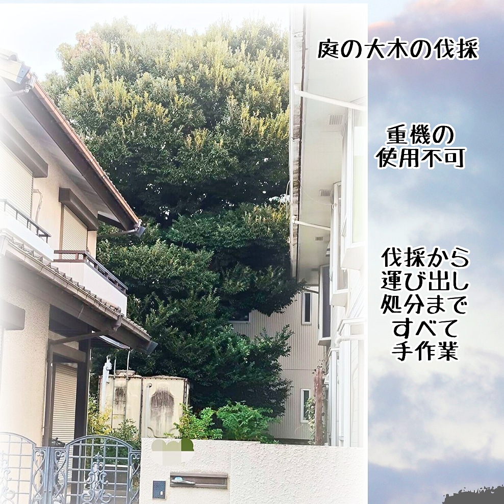 - 大きな車輌が入れない狭い住宅地内の高木伐採